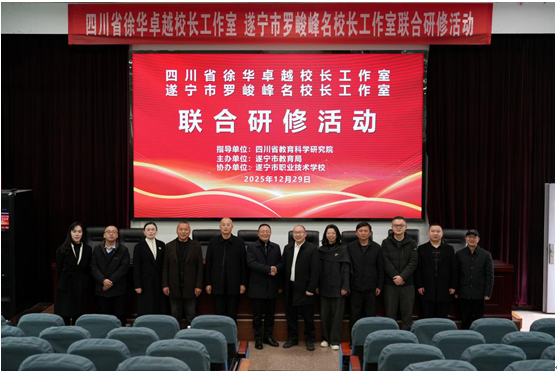 为深入贯彻国家职业教育高质量发展战略,积极应对人工智能时代与新质生产力发展对技能人才培养的新要求,2025年12月29日,由遂宁市教育局主办、四川省教育科学研究院指导,四川省徐华卓越校长工作室、遂宁市罗峻峰名校长工作室联合发起的职业教育研修活动,在我校圆满举行。